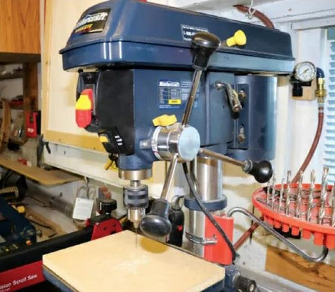 Elektrische Handbohrmaschine oder Bohrmaschine (abgebildet): Verwenden Sie eine Hand- oder Standbohrmaschine, um alle erforderlichen Führungslöcher in Ihr Holz zu bohren, bevor Sie mit dem Scrollen beginnen.