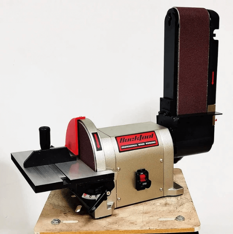 Doppelschleifmaschine: Eine große elektrische, stationäre Schleifmaschine eignet sich in Kombination mit einem Schwingschleifer hervorragend zum Formen und Glätten von Holz. Anstatt das Schleifwerkzeug über das Holz zu führen, bewegen Sie das Holz gegen das Schleifwerkzeug. Ich verwende gerne eine Doppelschleifmaschine, nachdem ich ein Stück für einen Untersetzer zugeschnitten habe. Ich finde, dass ich mit einer größeren Schleifmaschine wie dieser Kanten und Oberflächen schneller glätten kann als mit einem Schwingschleifer. Die abgebildete Doppelschleifmaschine ist ein 2-in-1-Band- und Tellerschleifer.