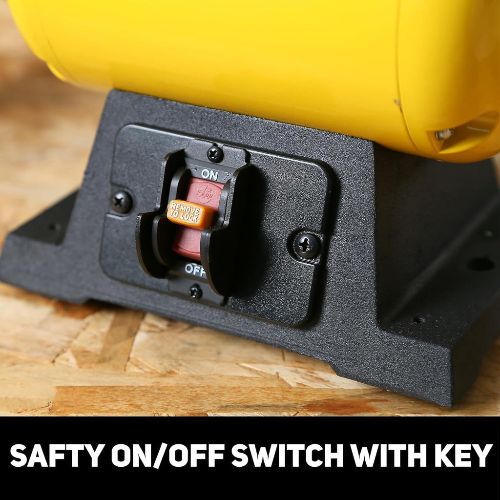 - Stable & Safety: The iron base with predrilled mounting holes provides a stable, weighted platform that prevents wobbling, ensuring durable performance. An on/off switch with a safety key enhances security and prevents unauthorized use