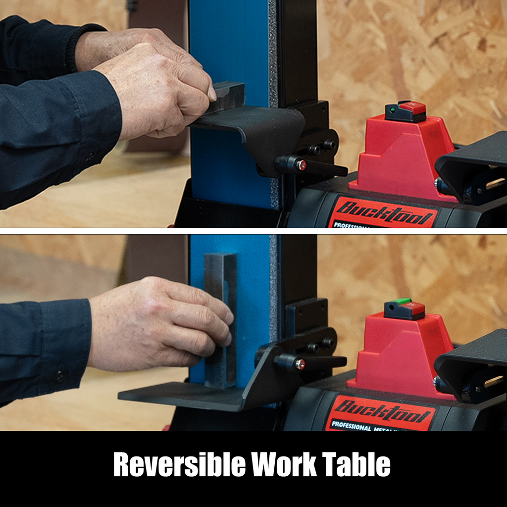 The heavy-duty dual worktables do more than just provide support. They feature a reversible design that expands the surface area for oversized workpieces. Additionally, the integrated 2-in-1 worktable/work stop enhances operator safety while providing a rock-solid reference point for precision grinding.